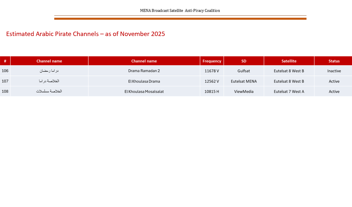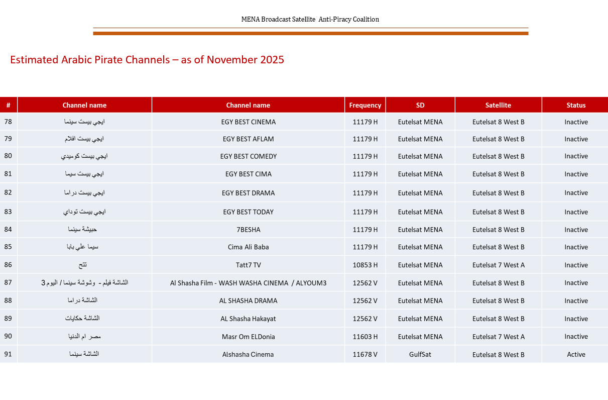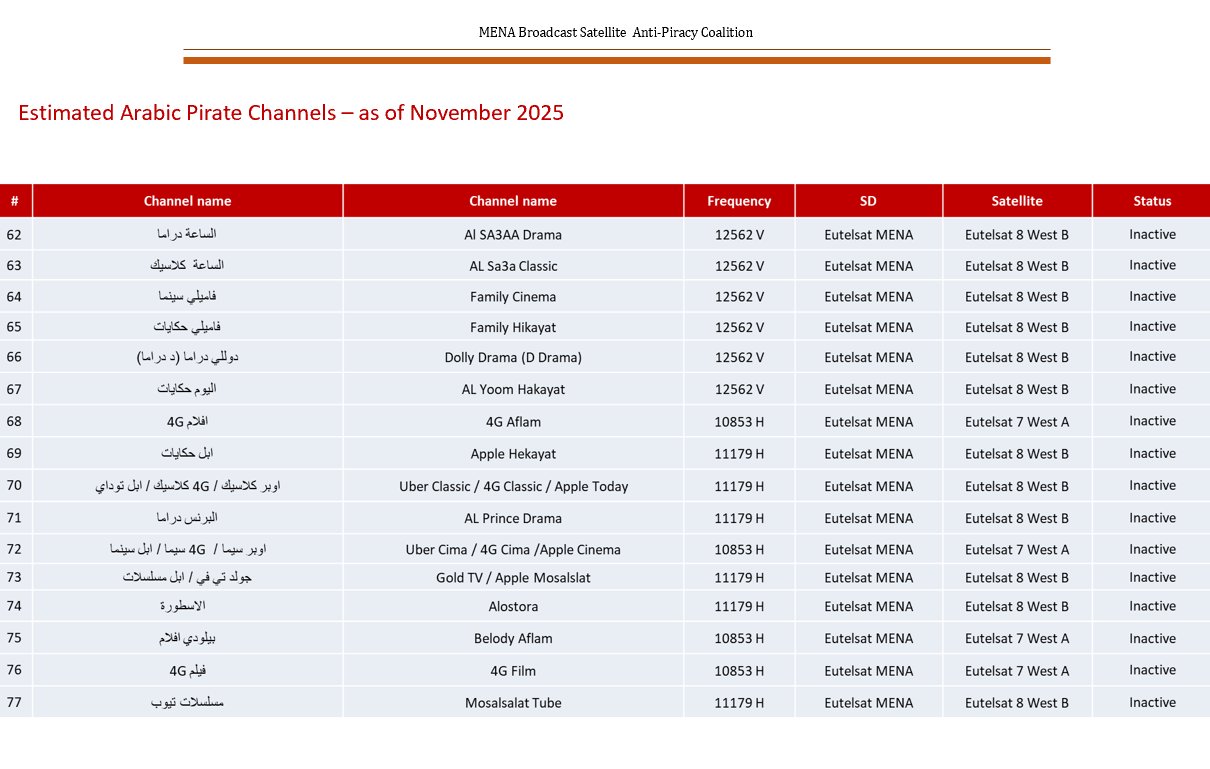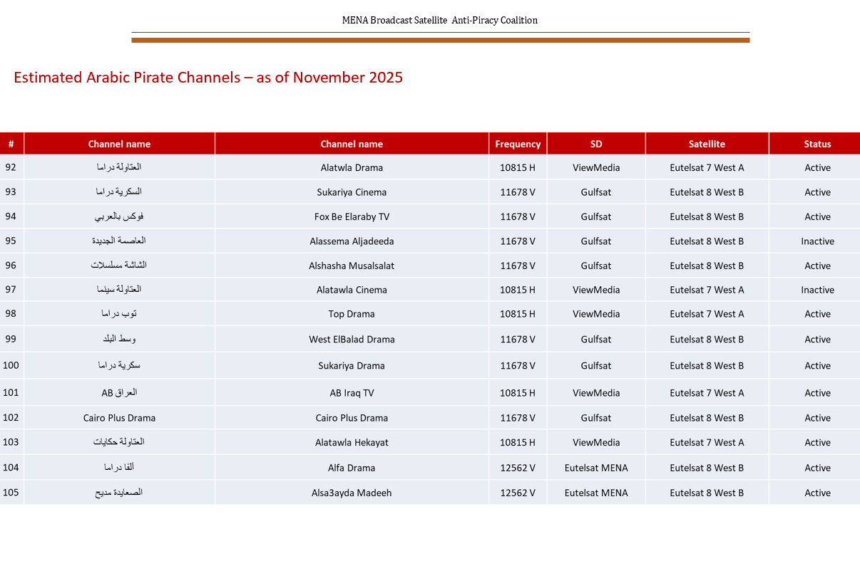 Infringement of copyright damages the whole media sector. Content producers cannot earn a return on their investment and audiences are exposed to unregulated content. The broadcasting members of the coalition including MBC, OSN, Rotana and ART monitor infringements of copyrighted content.